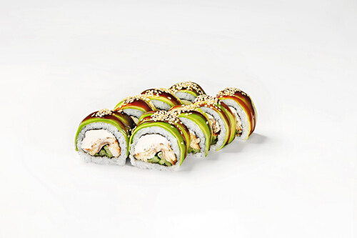 Норі, рис, крем сир, угорь, огірок, авокадо, соус унагі , кунжут.