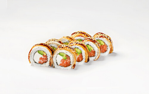Норі, рис, лосось, крем сир, авокадо, вугор, соус спайсі унагі,, кунжут.
