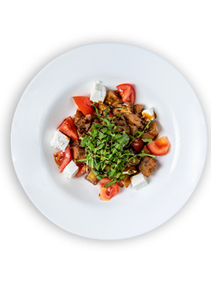 Баклажан, помідор, сир Фета, рукола, соус кисло-солодкий