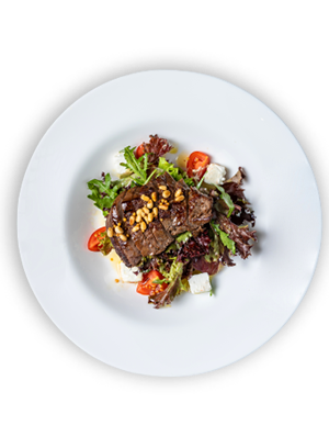 Яловичина, мікс салатів, сир Фета, соус, помідор Черрі, кедровій горіх