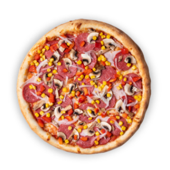 Соус томатний, сир Моцарелла, шинка, салямі, перець болгарський, кукурудза консервована, печериці, цибуля, спеції.