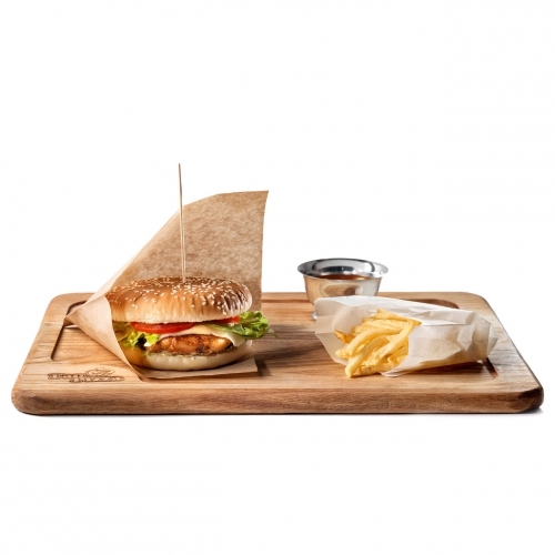 Соус цезар, курка, сир Моцарелла, свіжий помідор, салат Айсберг, подається з картоплею фрі.