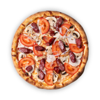 Соус томатний, сир Моцарелла, печериці, ковбаски мисливські, курка копчена, томати, цибуля ріпчаста