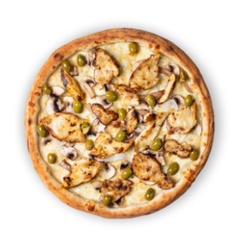 Оливкова олія, сир Моцарелла, курка, печериці, оливки, цибуля ріпчаста
