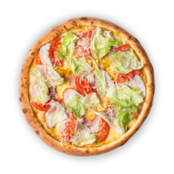 Соус гірчичний, сир Моцарелла, курка копчена, бекон, помідор, салат Айсберг, сир Пармезан