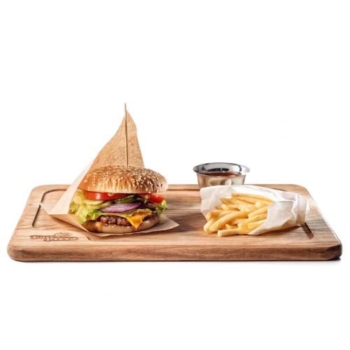 Соус биф, говяжья котлета, огурец соленый, свежий помидор, лук, сыр Чеддер, салат Айсберг. Подается с картошкой