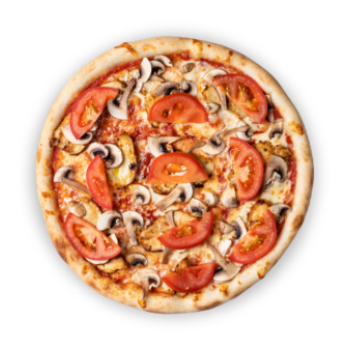 Соус томатный, сыр Моцарелла, курица, шампиньоны, томаты, карамелизованный лук